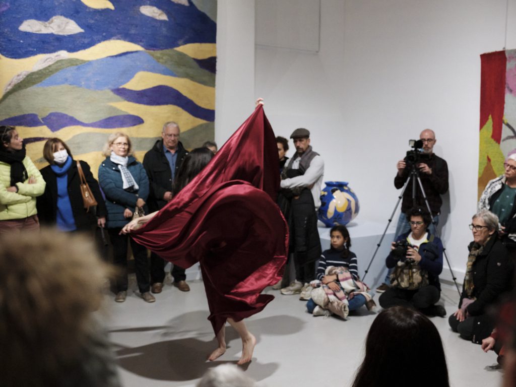 In situ, au sein de l’exposition « L’art et la matière » de tapisseries de basse-lisse réalisées par l’atelier 3 d’après des oeuvres d’artistes contemporains, Pierre Alechinsky, Arman, Huguette Arthur-Bertrand, Frédérique Bachellerie, Jean-Michel Basquiat, Enki Bilal, Pierre Boncompain, Bernard Cathelin, Robert Combas, Man Ray…, et céramiques de Pierre Boncompain…Lise Pauton accompagnée par le peintre Olivier Charpentier et la doreuse Michèle Pauton ont invité le public à une expérience intense où le corps en contorsion et la peintre s’entremêlent afin de dialoguer avec les oeuvres de l’exposition.