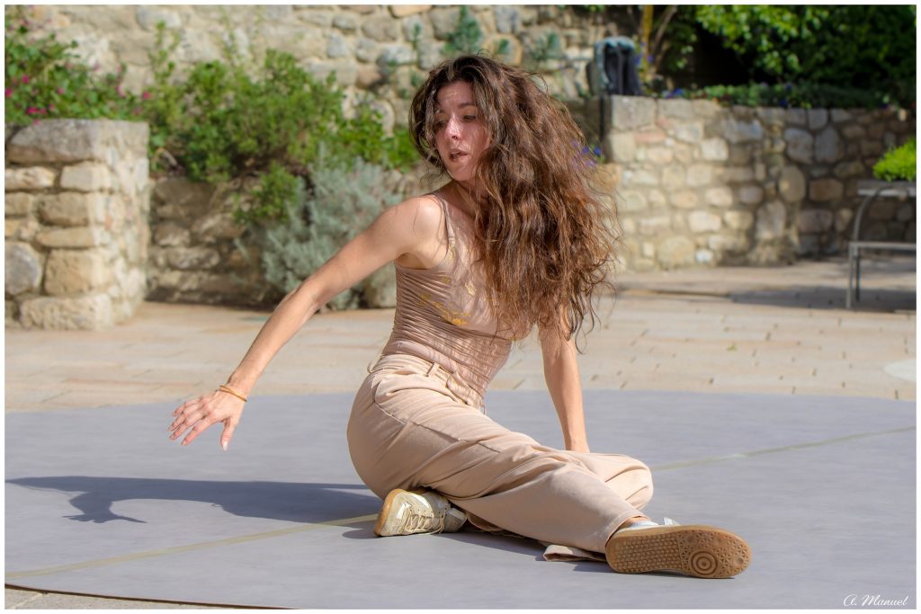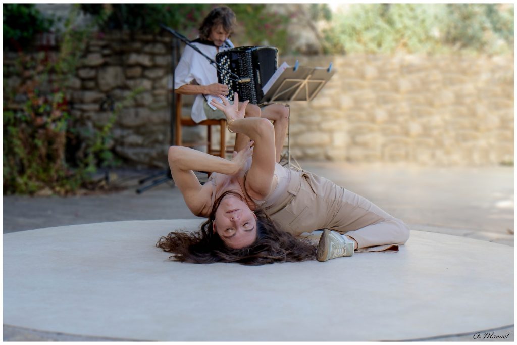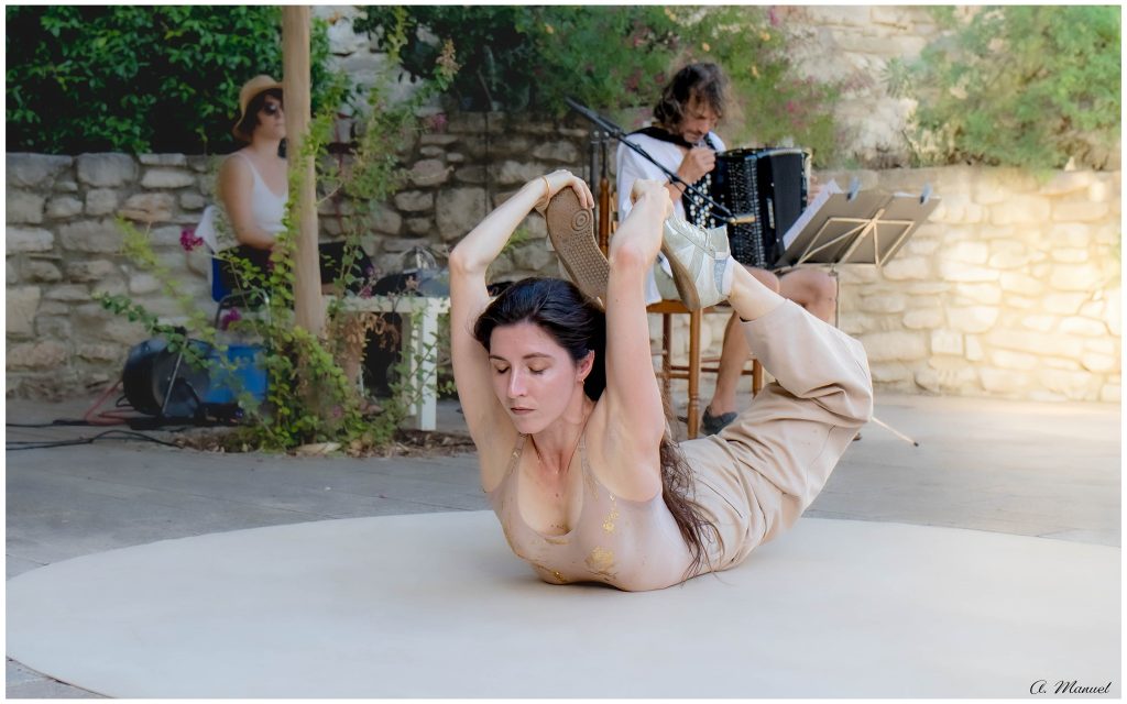Elle ne danse pas, mais son corps est chorégraphie, ses bras, ses jambes, ses hanches, son dos, son ventre, ses cheveux, sa tête, ses mains, tout bouge avec grâce et une belle musicalité, une interprétation sur différents modes pour une polyphonie du geste. Elle est libre et n’accepte rien qui pourrait venir entraver cette liberté. ll y a dans le corps de cette contorsionniste de la plus belle inspiration antique comme un signe de l’éternité, qui n’a de compte à rendre à quiconque .